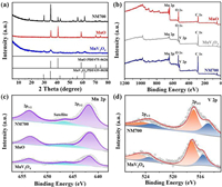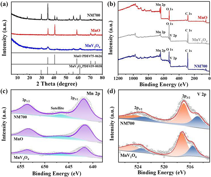 | Fig. 1. (a) XRD patterns of NM700, MnO and MnV2O4. (b) XPS survey spectrum of NM700, MnO and MnV2O4. (c, d) High-resolution XPS spectrum of Mn 2p, and V 2p respectively in the resulting NM700, MnO and MnV2O4. | |