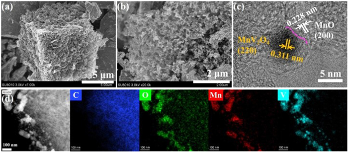 The TEM images in Fig. S5 (Supporting information) show that NM700 is consisted of stacked nanoparticles with a mean diameter of less than 100 nm, and there should be a layer of amorphous carbon on the surface of NM700, which probably originates from the decomposition of the MOF ligand, upgrading the inherent low electronic conductivity of manganese oxide and vanadium oxide materials. From the TEM image of NM700 in Fig. 2c, in addition, the observed lattice spacings of 0.228 nm and 0.311 nm are attributed to (200) plane of the MnO and (220) plane of the MnV2O4, respectively, which are well matched with the results of XRD. In the meantime, the above results manifest the existence of MnO/MnV2O4 heterostructure. Additionally, elemental mapping images demonstrate that C, O, Mn and V elements are distributed uniformly throughout the NM700 (Fig. 2d).