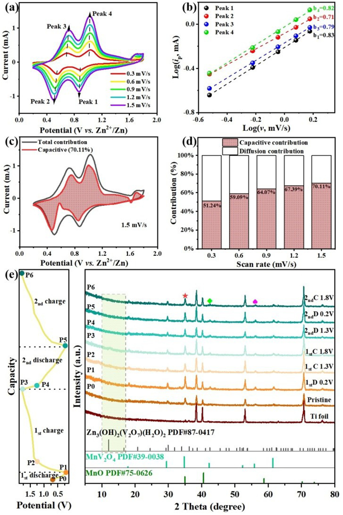 | Fig. 4. (a) CV curves at different scan rates. (b) log(i, current) and log(v, scan rate) plots at specific peak currents. (c) The capacitive contribution at 1.5 mV/s. (d) The contribution rate of capacitive capacities to total charge storage at different scan rates. (e) Ex situ XRD patterns of NM700 during the first and second discharge/charge cycles at 0.1 A/g. | |
