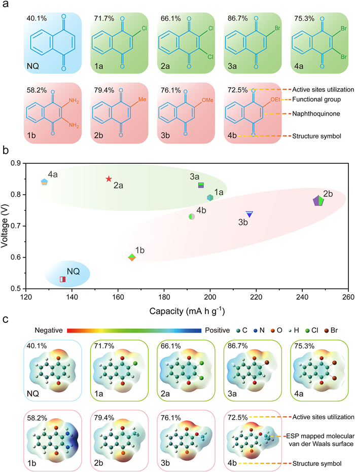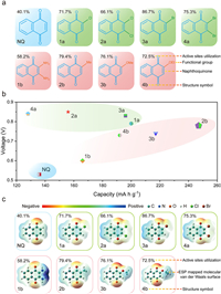 | Fig. 1. (a) Library of the NQ and NQ derivatives. (b) Voltages and capacities of the NQ derivative-based cathodes. (c) The ESP mapped molecular van der Waals surface of the NQ derivatives. | |