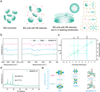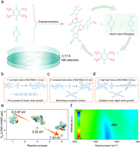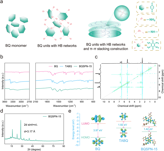 | Fig. 2. (a) Schematic illustration for the design route through the method of introducing HB networks. (b) FTIR spectra of the BQ, TABQ, and BQSPN-15. (c) 2D 1H-1H NOESY and (d) XRD spectra of the BQSPN-15. (e) HOMO/LUMO energy levels and orbit distribution of the BQ, TABQ, and BQSPN-15. | |