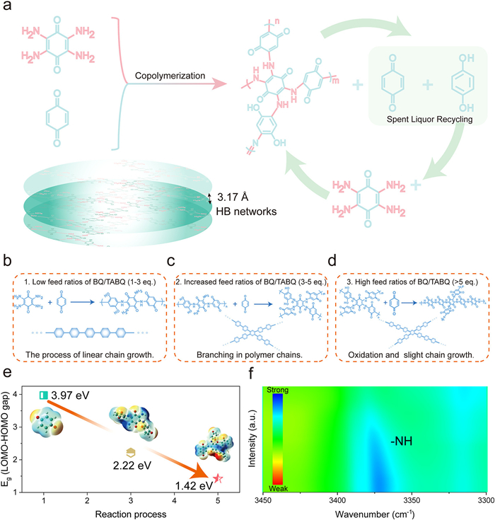| Fig. 3. (a) Schematic illustration for the synthesis of BQSPNs. Possible reaction process at (b) low (1–3 equiv.), (c) medium (3–5 equiv.), and (d) high (> 5 equiv.) feed ratios of BQ/TABQ. (e) The Eg (LUMO-HOMO gap) during the polymerization process. (f) In-situ variable temperature FTIR spectra of the BQSPN-15. | |