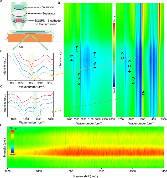 | Fig. 4. (a) Schematic diagram of in-situ FTIR analysis. (b) In-situ FTIR spectra of the BQSPN-15 cathode during the electrochemistry process. Changes of (c) C=N and (d) C=O during the discharge process in-situ FTIR spectra. (e) In-situ Raman spectrum of the BQSPN-15 cathode during the electrochemistry process. | |