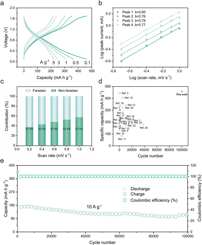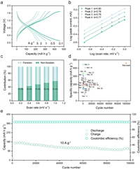 | Fig. 5. (a) Discharge/charge curves of BQSPN-15//Zn batteries at different current densities. (b) Power law dependence of the measured current on scan rate at corresponding peak potentials. (c) Contribution ratios of the capacitive charge storage at different scan rates. (d) Capacity and cycle life comparison with the reported cathode materials in AZIBs (the numbers refer to references in Supporting Information). (e) Cycling performance of the BQSPN-15 at 10 A/g. | |