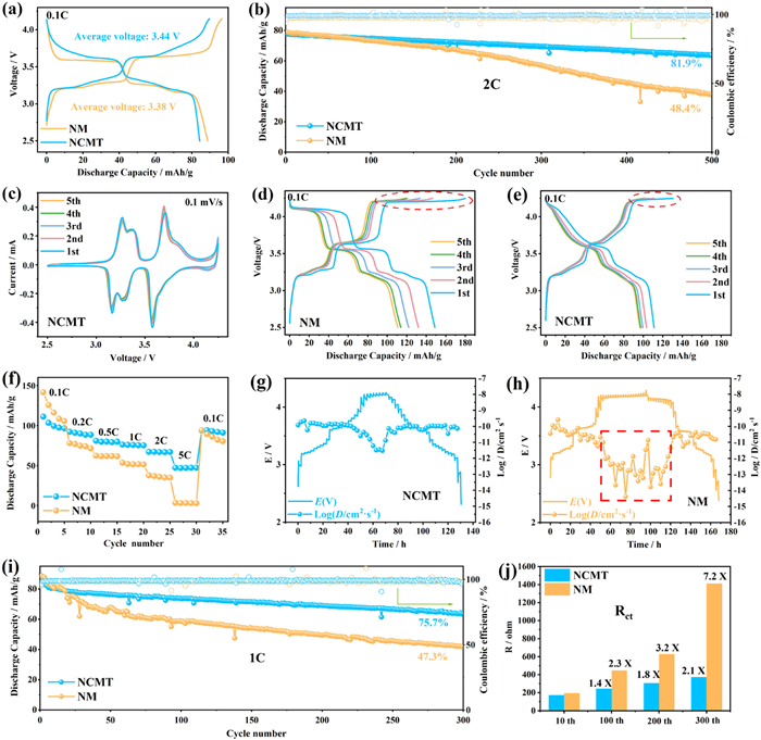 | Fig. 2. (a) The first charge-discharge curves within 2.5–4.15 V at 0.1 C for NM and NCMT electrodes. (b) Cycling performance of NM and NCMT electrodes at 2 C within 2.5–4.15 V. (c) CV profiles at a scan rate of 0.1 mV/s within 2.5–4.25 V of NCMT electrode. (d, e) The charge-discharge curves from the first to the fifth cycles in the voltage range of 2.5–4.25 V of NM and NCMT. (f) Rate performance of NM and NCMT electrodes from 0.1 C to 5 C in the voltage range of 2.5–4.25 V. GITT profiles for (g) NCMT and (h) NM electrodes. (i) Comparison of cycle performance at 1 C within 2.5–4.25 V. (j) The fitted Rct of NCMT and NM electrodes. | |