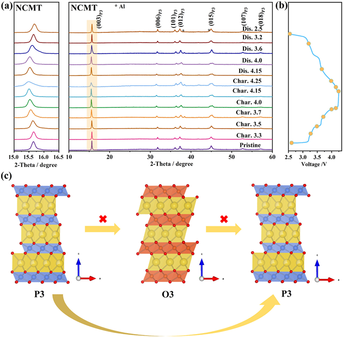 | Fig. 3. (a) Ex situ XRD patterns of NCMT electrode at various discharge and charge states and corresponding magnified region of 15°–16.5° on the left. (b) The corresponding states of the ex situ XRD patterns in the charge and discharge profiles. (c) The structural evolution schematic for NCMT sample. | |