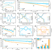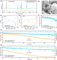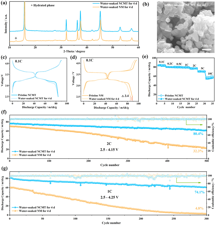 | Fig. 4. (a) The magnifying XRD patterns of water-soaked NM and NCMT samples for 4 d. (b) The SEM image of water-soaked NCMT sample for 4 d. (c, d) The first charge-discharge curves of water-soaked NCMT and NM for 4 d in the voltage range of 2.5–4.15 V. (e) The comparison of rate performance between water-soaked NCMT for 4 d and pristine NCMT electrodes from 0.1 C to 10 C. (f) Cycle performance of water-soaked samples for 4 d within 2.5–4.15 V at 2 C. (g) Cycle performance of water-soaked samples for 4 d within 2.5–4.25 V at 1 C. | |