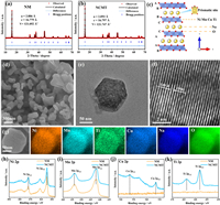 | Fig. 1. XRD patterns and Rietveld refinement plots of (a) NM and (b) NCMT samples. (c) Crystal structure schematic of NCMT sample. (d) SEM image of NCMT sample. The typical (e) TEM image and (f) HRTEM image of NCMT sample. (g) Energy dispersive spectroscopy (EDS) mapping of NCMT sample. XPS spectra of (h) Ni, (i) Mn, (j) Cu and (k) Ti elements for the NM and NCMT samples. | |