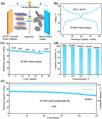 | Fig. 5. (a) Schematic illustration of the Na-ion full cell. (b) The first charge and discharge curves of full cell in the voltage range of 2.5–4.05 V. (c) The rate performance from 0.1 C to 2 C. (d) Capacity retention at different current densities. (e) The cycling performance when cycled at 0.5 C. | |