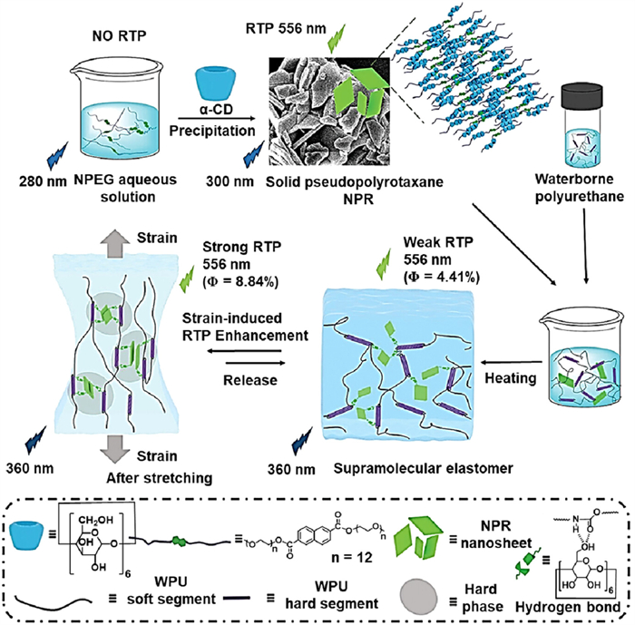 As an important signal in response to mechanical force, phosphorescence has the advantages of long luminescence lifetime, large Stokes shift, and involvement of triplet states [5]. Recently, Yong Chen, Yu Liu and co-workers from Nankai University synthesized a pseudopolyrotaxane (NPR) utilizing α-CD and naphthalene-derived polyethylene glycol (NPEG) (Fig. 1) [6]. The PEG chains, anchored at both ends of the naphthalene moiety, are threaded through the α-CD cavities, thereby forming the NPR. By combining NPR with waterborne polyurethane (WPU), they prepared supramolecular elastomers exhibiting reversible mechanically responsive room temperature phosphorescence (RTP) enhancement during the mechanical stretching process. The incorporation of CDs containing abundant hydroxyl groups not only facilitates the attainment of prolonged phosphorescence emission via the macrocyclic confinement effect but also augments mechanical properties through the establishment of hydrogen bonds with WPU chains. The resultant elastomer exhibits robust RTP characteristics, maintaining emission stability in aqueous solutions and diverse chemical environments. Notably, under a 200% strain, the phosphorescence intensity increases threefold owing to the further suppression of non-radiative transitions and NPR vibrations. Lastly, the developed RTP elastomer finds applications in information security and encryption.