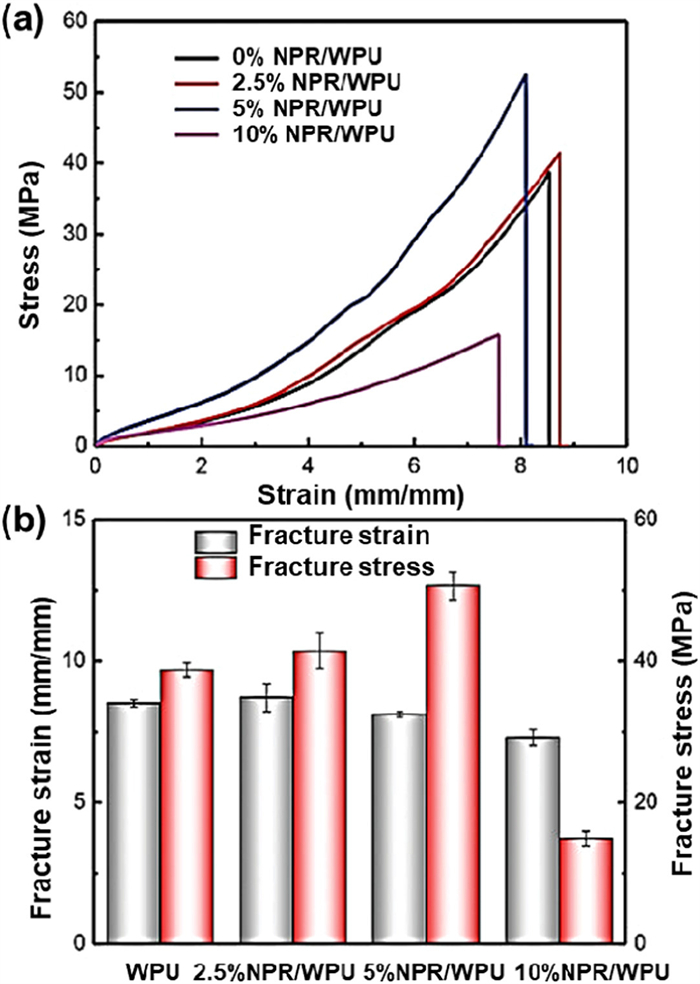 The mechanical analysis revealed that the inclusion of NPR enhances both the strength and toughness of the WPU elastomer (Figs. 2a and b). Among various NPR masses investigated, the elastomer containing 5% NPR/WPU demonstrated the most favourable mechanical behaviour, exhibiting a fracture strain of 812%, fracture stress of 50.7 MPa, elastic modulus of 8.6 MPa, and toughness of 148 MJ/m3. In comparison to the WPU elastomer alone, the 5% NPR/WPU composite displayed a notable enhancement in mechanical properties. Additionally, cyclic stretching measurements up to 200% strain indicated that the supramolecular elastomer containing 5% NPR/WPU exhibited excellent resilience.