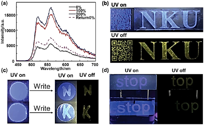 | Fig. 3. (a) The phosphorescence emission spectrum (delay = 0.1 ms) of 5% NPR/WPU under different strain (λex = 360 nm). (b) Pattern information storage performed by printing NPR/ink onto PMDS substrate. (c) Writable RTP hydrogel for information storage. (d) Data encryption process by fixing tailored luminescence elastomer in WPU elastomer in the atmospheric and water environment (pattern “s”: NPEG/WPU samples; pattern “top": NPR/WPU samples). Reproduced with permission [6]. Copyright 2024, Wiley Publishing Group. | |