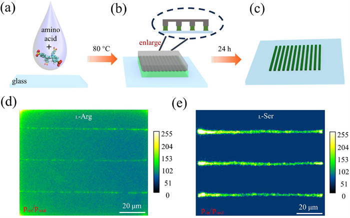 | Fig. 1. (a-c) Schematic diagram of the assembly process of micro-nano structures. Second harmonic images of (d) L-Arg and (e) L-Ser induced TPPS with p-in/p-out polarization combinations. The exposure time was 40 s, the average laser power was 50 mW, and the magnification was 40×. | |