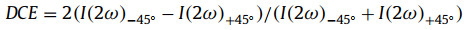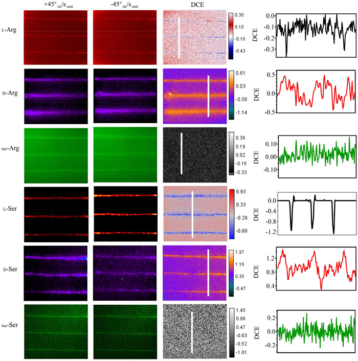 | Fig. 2. SHG imaging (+45°-in/S-out and −45°-in/S-out polarization combination) of micro-nano structures incorporating different amino acids and calculated DCE mapping. The DCE value on the white cut line in DCE mapping is represented by the right column. It clearly shows that serine induced chiral assembly structure of TPPS exhibits greater order than arginine. The exposure time was 40 s, the average laser power was 50 mW, and the magnification was 40×. | |