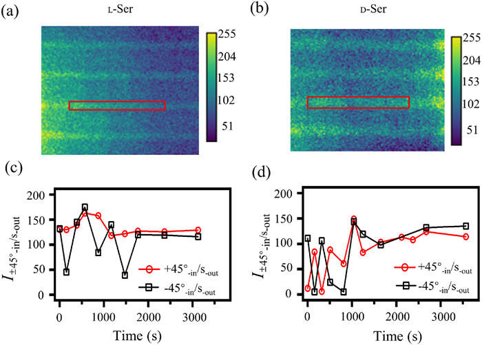| Fig. 4. SHG intensity under +45°-in/S-out and −45°-in/S-out polarization combinations as a function of time. (a, c) L-Ser and (b, d) d-Ser are added to the solution. The gray values in (c, d) are the average shown in the red rectangular of (a, b). (a) and (b) are the SHG imaging during the assembly process, used to illustrate the regions for the calculated average gray values shown in (c) and (d). | |