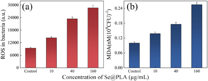 Fig. 4a shown the impact of Se@PLA treatment on the fluorescence intensity of ROS in Xoo. At 10 µg/mL, the fluorescence intensity of ROS increased by nearly 50%, and at 40 µg/mL, it exhibited a 150% increase. When the concentration of Se@PLA reached 160 µg/mL, the ROS fluorescence intensity was found to be three times of the control group. The MDA assay revealed that the lipid peroxidation levels in Xoo treated with 160 µg/mL of Se@PLA increased by 150% (Fig. 4b). These results signify that Se@PLA induces excessive ROS production in Xoo, surpassing the intrinsic antioxidant capabilities of bacteria. Consequently, the imbalance between the oxidation and antioxidant systems arises, leading to cellular damage. The peroxidation of lipids in cell membranes and lipoproteins disrupts membrane permeability, impairs bacterial physiological activities, and ultimately resulted in bacterial cell death [39,40]. Hence, the antibacterial effect of Se@PLA may be attributed to the interaction between materials and Xoo, which induces the overproduction of reactive oxygen within bacterial cells. The oxidative stress resulted in cell membrane injury and bacterial death. A similar mechanism was also observed when treating Xcc with Se/C [16].