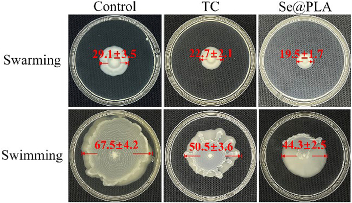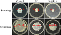| Fig. 5. Effects of Se@PLA (2 µg/mL) on the swarming and swimming motilities of Xoo. | |