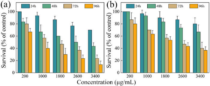 | Fig. 6. Survival rates of zebrafish treated with (a) TC and (b) Se@PLA for 24, 48, 72, and 96 h. | |