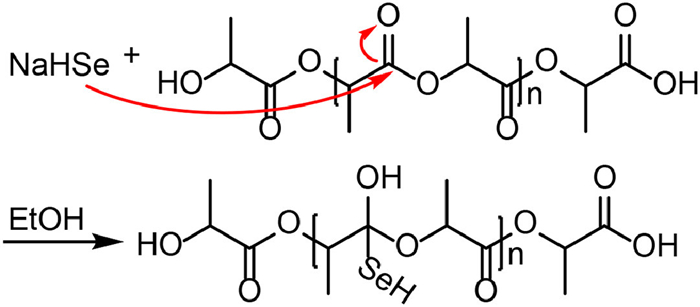 Polylactic acid (PLA) is a biodegradable material that can be synthesized from lactic acid, which is a product derived from corn straw via fermentation [36]. Thus, using PLA as the support of Se is an environment-friendly approach. NaHSe was obtained in situ by reducing selenium powder with NaBH4 in ethanol. The PLA particles were prepared via the solvent evaporation method, followed by stirring them in NaHSe solution for 24 h. After 2–3 times of ultrasonic washing, the product was separated by centrifugation at 8500 rpm for 7 min and dried in a freeze-drying machine for 24 h to obtain a pink powder (Se@PLA). During the process of selenization, the selenized reagent attacks the carbonyl group to produce -SeH, and Se2− attributed to the -SeH moieties anchored onto the material surface via Se-C bond (Scheme 1).