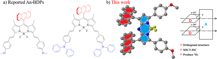 The introduction of heavy atom is well-known to efficiently improve the efficiency of intersystem crossing (ISC) [28–34], thereby generating reactive oxygen species (ROS) for PDT. However, there is also a risk of disengage of the heavy atom and the potential dark toxicity. Therefore, in recent years, heavy-atom-free BODIPY photosensitizers (PSs) have been sought after. Indeed, dimeric BODIPYs and structurally twisted BODIPYs are able to produce ROS [35–42]. Moreover, spin-orbit, charge-transfer intersystem crossing (SOCT-ISC) can directly overcome the disadvantages of the traditional heavy-atom effect and improve the generation efficiency of ROS [43–48]. The SOCT-ISC mechanism was firstly proposed by Willigen, who designed an orthogonal configuration between naphthalene and acridine [49]. Upon photoexcitation, charge separation and charge compounding processes took place in this molecule, and then ISC process was achieved. It is found that anthracene as a typical segment can promote SOCT-ISC under irradiation. Since the orthogonal molecular orbitals of donor-acceptor (D-A) pairs favor the SOCT-ISC transition, BODIPY with the anthracyl group at meso site was popularly designed, owing to steric hindrance to produce a big dihedral angle between the two molecular orbital (MO) planes. According to the X-ray crystallography, indeed the orthogonal structure between the anthracyl group at meso site and the parent nucleus BODIPY was confirmed by Yang et al. [50]. Subsequently, Sun et al. reported heavy-atom-free nanomaterials based on An-BDP with the methoxy groups, which promotes ISC by SOCT and enhances the generation of ROS, plays an active part in the realization of PDT (Fig. 1a) [29]. By introducing a stronger electron donating diphenylamino group, instead of the methoxy group in An-BDP, the conjugation of anthracene onto the BODIPY moiety at meso site enhances the ISC by SOCT, and acts as storage for the reversible capture and release of ROS to enhance PDT efficacy (Fig. 1a) [51].