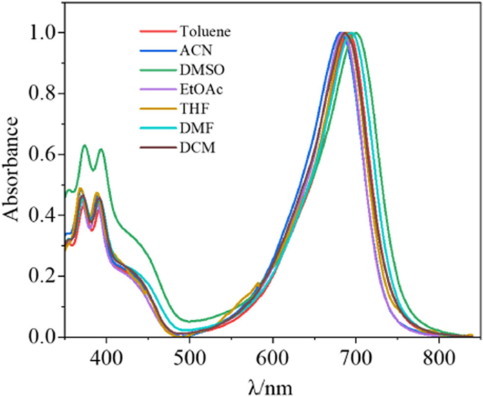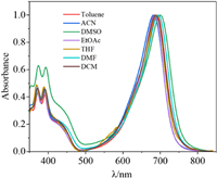 | Fig. 2. Normalized absorption of An-azaBDP in various organic solutions at 298 K. | |