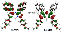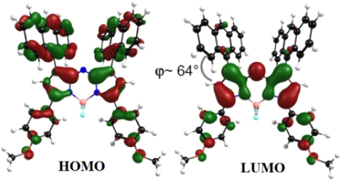 | Fig. 3. Frontier molecular orbitals of An-azaBDP at the B3LYP/6–31G(d) level with Gaussian 09. LUMO/HOMO (eV) = −3.053/−4.974. | |