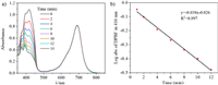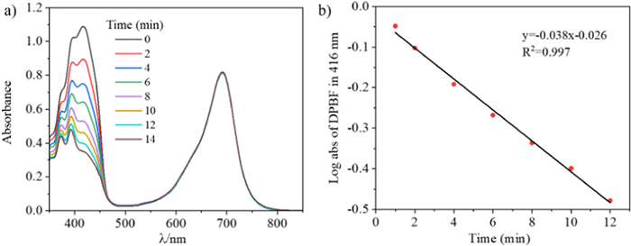 | Fig. 4. (a) Time-dependent photodegradation of DPBF with An-azaBDP. (b) DPBF degradation rate curves with An-azaBDP (S = 0.038) in toluene. | |
