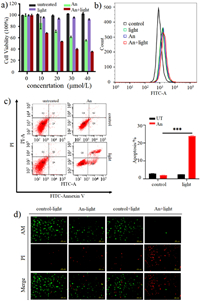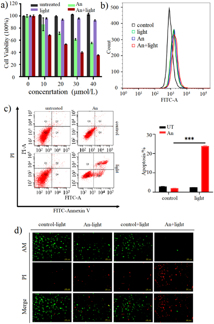 | Fig. 5. (a) Cell viability was analyzed by CCK-8 assays in SW620 cells to determine the concentration-dependent effect of An-azaBDP (0–40 µmol/L). (b) SW620 cells were treated with An-azaBDP (40 µmol/L) alone, light alone, or their combination, the intracellular ROS levels were detected by flow cytometry. (c) Apoptosis analysis was performed using flow cytometry in SW620 cells after treatment with An-azaBDP (40 µmol/L) alone, light alone, or their combination. Light irradiation (0.3 W/cm2, 20 min) was conducted after cells were incubated with An-azaBDP. An-azaBDP treatment with laser irradiation was shown to induce more apoptosis. (d) Fluorescence images of co-stained AM and PI on SW620 cells after 40 µmol/L An-azaBDP-treated with or without 690 nm laser irradiation (0.3 W/cm2) for 20 min. Scale bar: 100 µm. For clarity, An-azaBDP is abbreviated as An. Mean ± standard deviation (SD) (n = 3); ***P < 0.001. | |