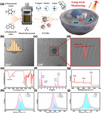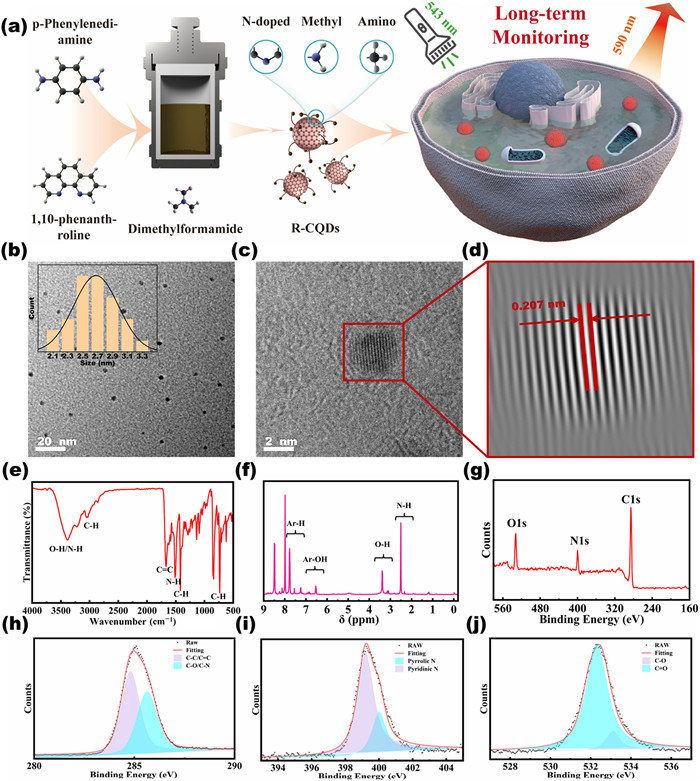 | Fig. 1. Synthesis and characterization of CQDs. (a) Schematic of the R-CQD synthesis process. (b) TEM images of R-CQD, and particle size distribution. (c) HRTEM image of R-CQD. (d) Enlarged and fast Fourier transform (FFT) transformed HRTEM image highlighting the 0.207 nm crystal plane spacing. (e) FTIR of R-CQD. (f) 1H NMR spectrum of R-CQD. (g) XRD spectra and high-resolution, (h) C 1s, (i) N 1s and (j) O 1s of R-CQD. | |