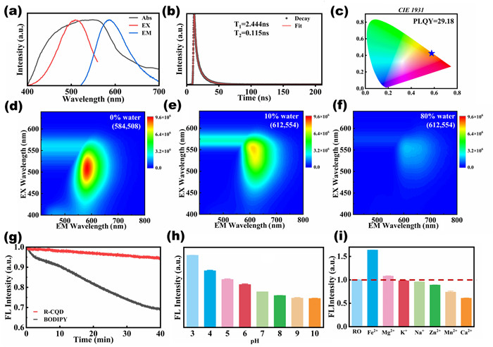 | Fig. 2. Fluorescent properties of R-CQD. (a) absorption, excitation and emission spectra of R-CQD in glyceryl trioleate. (b) Fluorescence lifetime spectra in glyceryl trioleate. (c) CIE1931 coordinates in glyceryl trioleate. (d–f) The excitation-emission matrices of R-CQD in the mixture of H2O and 1,4-dioxane. (g) Kinetics of R-CQDs and BODIPY. (h) Fluorescence intensity in different pH solutions. (i) Fluorescence intensity in a solution containing metal ion. Error bars represent the standard deviation (SD) for n = 3. | |