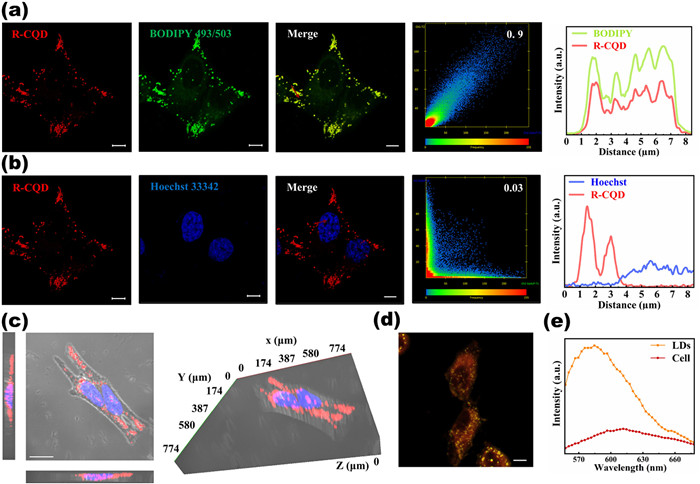 | Fig. 3. LDs targeting property. Confocal fluorescence images and co-localization characterization Images of HeLa cells co-stained with R-CQD and commercial organelle probes (a) BODIPY 493/503 and (b) Hoechst 33342. (c) 3D images of HeLa cells co-stained with Hoechst 33342 and R-CQD (vertical, main, and left views). (d) True-color fluorescence images of live HeLa cells stained with R-CQD. (e) In-situ fluorescence spectra of the LD and cytoplasm in HeLa cells. Scale bar: 10 µm. | |
