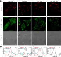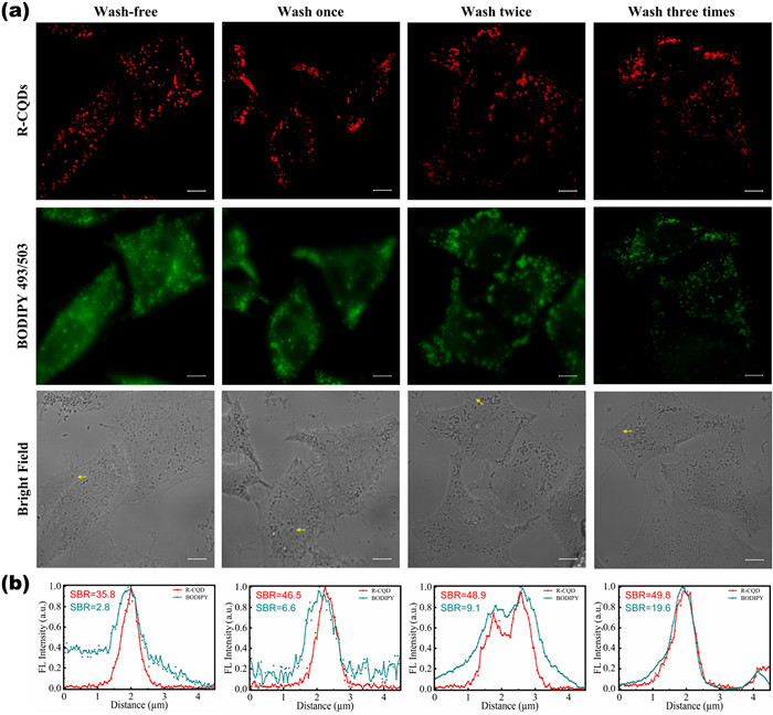 | Fig. 4. Comparison of Wash-Free Imaging Capabilities. (a) CLSM images of HeLa cells stained with R-CQD and BODIPY 493/503 after washing without and with PBS. The yellow arrows indicate selected regions of fluorescence intensity profiles. (b) Signal-to-background ratio obtained by (a). Scale bar: 10 µm. | |
