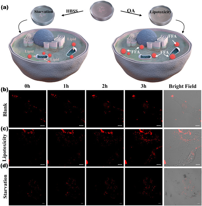 | Fig. 5. Long-term monitoring of HeLa cell under diverse pathological conditions. (a) Schematic representation of changes in LDs of HeLa cells in different pathological states. (b) CLSM images of HeLa cells in normal state over a period of 3 h. (c) CLSM images of HeLa cells in 3 h after addition of 0.5 mmol/L OA. (d) CLSM images of HeLa cells in 3 h after starvation treatment. Scale bar: 10 µm. | |