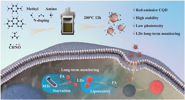 In summary, we have developed R-CQD, an efficient LD-specific probe with excellent optical properties using a solvothermal strategy. Importantly, red fluorescence significantly reduces phototoxic damage to cells from long-term monitoring. Benefiting from the excellent biocompatibility, outstanding fluorescence properties, high photostability, and remarkable solvatochromism, R-CQDs were successfully applied for wash-free targeted imaging LDs in living cells for long-term monitoring. This stability and safety monitoring capability enable successful and dynamic visualization of LDs during oleic acid induced lipotoxicity and starvation treatment in a long term of 3 h. We believe that the findings presented in this work hold great significance for understanding the mechanism of LD regulation in living cells, providing an effective tool for studying related diseases.