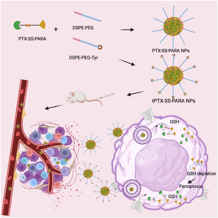 In summary, for further consumption of intracellular GSH to induce ferroptosis, we designed a prodrug by conjugation PTX with PARA through a disulfide bond. The prodrug was able to self-assemble into uniform nanoassemblies. LAT1 was chosen as a target for TNBC treatment. Tyrosine-decorated DSPE-PEG was applied for LAT1 targeting. As a result, the tPTX-SS-PARA NPs showed higher cytotoxicity, stronger proliferation and clone formation inhibition than PTX-SS-PARA NPs. Both the two nanoparticles could induce ferroptosis in 4T1 cells and showed potent chemo-ferroptosis antitumor activity in vivo. Our work offers a simple prodrug strategy to combine chemotherapy and ferroptosis for antitumor therapy.