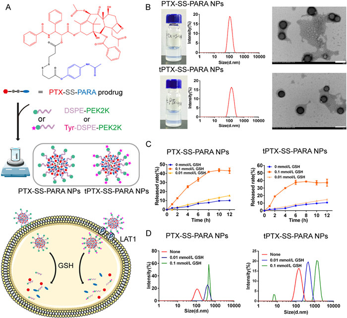 | Fig. 2. Characterization of PTX-SS-PARA nanoassemblies. (A) The assembly progress of PTX-SS-PARA prodrug by one-step nanoprecipitation method. (B) Particle size distribution and TEM images of PTX-SS-PARA NPs and tPTX-SS-PARA NPs. Scale bar: 200 nm. (C) In vitro reduction-responsive drug release in pH 7.4 PBS with 0, 0.01 and 0.1 mmol/L GSH. Data are presented as mean ± SD (n = 3). (D) The changes of particle size distribution after 12 h incubation with different release medium. | |