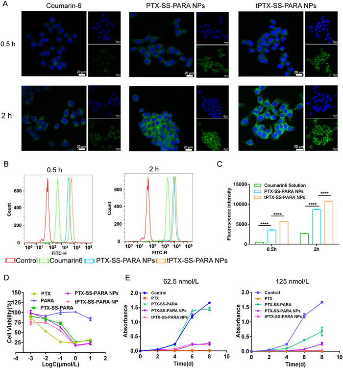| Fig. 3. (A) CLSM images of 4T1 cells incubated with free coumarin-6 or coumarin-6-labeled prodrug nanoassemblies for 0.5 and 2 h. The scale bar represents 20 µm. Blue: nuclei. Green: coumarin-6. (B) Flow cytometer measurements of 4T1 cells treated with free coumarin-6 or coumarin-6-labeled prodrug nanoassemblies for 0.5 and 2 h. (C) Fluorescence intensity analysis of flow cytometer measurements. (D) Cell viability was treated with various concentrations of PTX solution, prodrug and prodrug nanoassemblies for 48 h. (E) Growth of 4T1 cells treated with PTX solution, prodrug and prodrug nanoassemblies (equivalent to 62.5 and 125 nmol/L PTX). Data are presented as mean ± SD (n = 3). ****P < 0.0001. | |