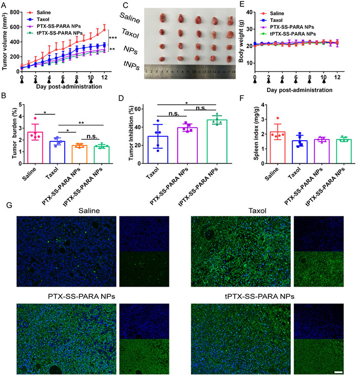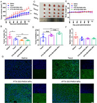 | Fig. 5. In vivo antitumor efficacy of Taxol and prodrug nanoassemblies against 4T1 tumors. (A) Tumor volume. (B) Tumor burden. (C) Images of tumor. (D) Body weight change. (E) Tumor inhibition. (F) Spleen index. (G) Tunnel assay. Scale bar: 100 µm. Data are presented as the mean ± SD (n = 5). n.s., no significance. * P < 0.05, **P< 0.01, *** P < 0.001. | |