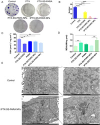 | Fig. 4. (A) Images of clone formation treated with PTX solution, prodrug and prodrug nanoassemblies. (B) Clone number of treated with each group. (C) GSH level in 4T1 cells treated with prodrug, PARA and prodrug nanoassemblies. (D) MDA level in 4T1 cells treated with prodrug, PARA and prodrug nanoassemblies. (E) Bio-TEM images of mitochondrion treated with tPTX-SS-PARA NPs. Scale bar: 2 µm (left) and 1 µm (right). Data are presented as mean ± SD (n = 3). * P < 0.05, **P< 0.01, *** P < 0.001, **** P < 0.0001. | |