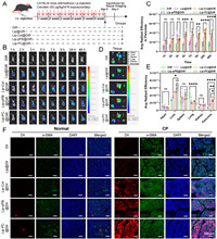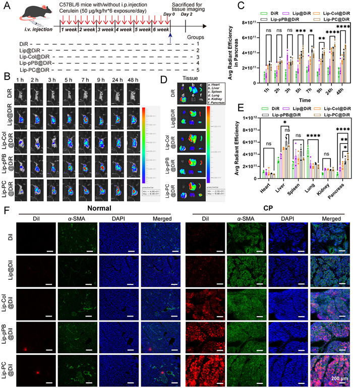| Fig. 3. (A) Schematic summary of animal studies. (B, C) Representative in vivo near-infrared fluorescent images of mice conducted with caerulein for 6 weeks, acquired 1, 2, 3, 5, 7, 9, 24 and 48 h after intravenous injection of different preparations. (D, E) Fluorescence intensity in heart, liver, spleen, lung, kidney and pancreas of mice treated with caerulein for 6 weeks, expressed as average radiant efficiency units. (F) Colocalization of DiI and DiI-labeled liposomes with α-SMA in the pancreas of fibrotic mice treated with caerulein for 6 weeks. Pancreas tissue was sectioned and immunostained with α-SMA (green) for PSCs and counterstained with the nuclear dye, DAPI (blue). Fluorescence of DiI is shown in red. Scale bar: 200 µm. Values are expressed as means ± SD (n = 3). *P < 0.05, **P < 0.01, ***P < 0.001, ****P < 0.0001. ns, no significant difference. | |