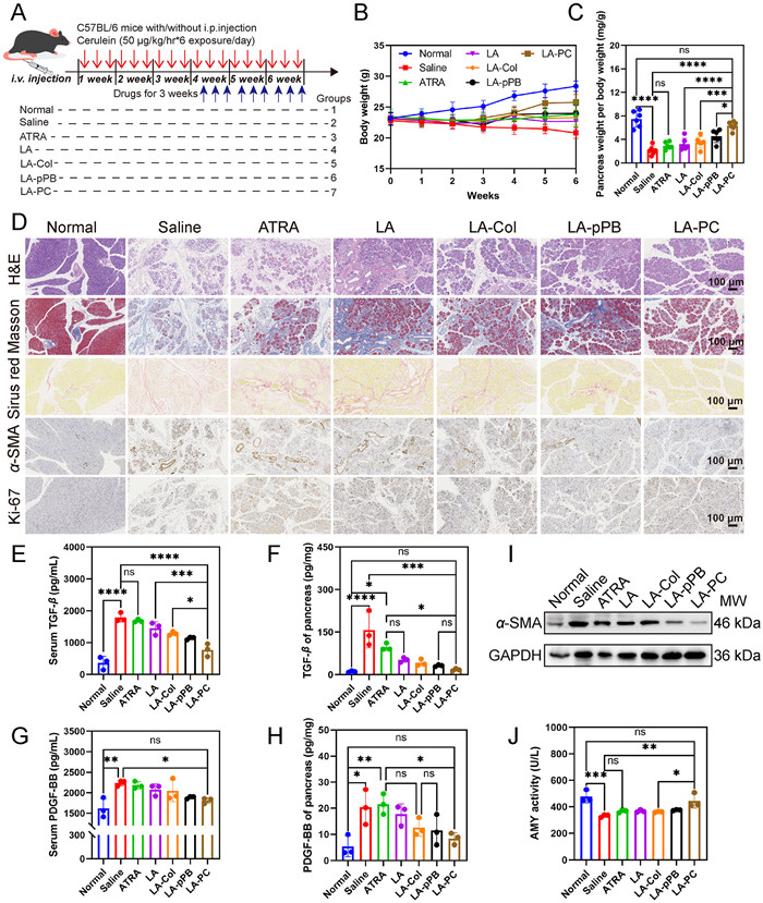 | Fig. 4. (A) Schematic summary and dosing regimen of animal pharmacodynamic studies. (B) Body weight of both control and treatment groups was monitored over the 6 weeks’ experimental period. (C) Pancreatic tissues were weighed at the end of experiment and shown as pancreas weight per body weight. (D) Representative H&E, Masson, Sirius Red and IHC staining (α-SMA and Ki-67) of pancreas tissue sections. Scale bar: 100 µm. (E, F) Serum and tissue TGF-β in normal and fibrotic mice with or without different treatments. (G, H) Serum and tissue PDGF-BB in normal and fibrotic mice with or without different treatments. (I) Western blot analysis of α-SMA and GAPDH in pancreatic tissue. (J) Serum AMY activity in normal and fibrotic mice with or without different treatments. Values are expressed as means ± SD (n = 3). *P < 0.05, **P < 0.01, ***P < 0.001, ****P < 0.0001. | |