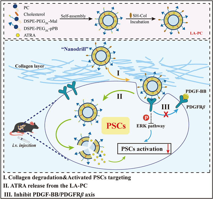 Herein, we constructed all-trans retinoic acid (ATRA)-loaded liposomes co-decorated with pPB (C*SRNLIDC*) and collagenase (Col) (LA-PC) for CP therapy. The pPB is a cyclic peptide that targets PDGFRβ [21], while ATRA is a pharmaceutical agent known to suppress PSCs activation [11,23]. The design of LA-PC aims to synergistically induce quiescence in PSCs from both intracellular and extracellular aspects (Scheme 1). Following intravenous administration, the surface-bound Col facilitates LA-PC penetration into the fibrotic pancreas. The surface-modified pPB peptide enables the LA-PC to selectively target activated PSCs, promoting drug uptake by PSCs and concurrently inhibiting the PDGF-BB/PDGFRβ axis in PSCs. This dual regulation strategy, targeting both intracellular and cell surface receptors, will offer new possibilities for CP treatment.