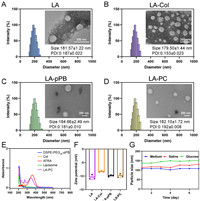 | Fig. 1. (A–D) Size distribution and TEM image (inserted) of LA, LA-Col, LA-pPB, LA-PC. (E) Ultraviolet-visible spectra of DSPE-PEG2K-pPB, Col, free drugs, LA-PC and blank liposome. (F) Zeta potential of LA, LA-Col, LA-pPB, LA-PC (n = 3). (G) Stability of LA-PC in saline, glucose and 10% FBS-DME/F12 medium. | |