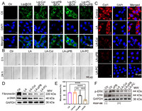 | Fig. 2. (A) Cellular uptake images of Lip@C6, Lip-Col@C6, Lip-pPB@C6, Lip-PC@C6 and pretreated PDGFR-β antibody Lip-PC@C6. C6 were shown in green and nucleus were shown in blue. Scale bar: 10 µm. (B) Wound-healing assay of PSCs, respectively. Scale bar: 100 µm. (C) Immunofluorescence staining of collagen I after treatment of activated PSCs with different preparations. Scale bar: 10 µm. (D) Western blot analysis of fibronectin, α-SMA and glyceraldehyde-3-phosphate dehydrogenase (GAPDH). (E) Quantitative analysis of wound closure of LA, LA-Col, LA-pPB and LA-PC. (F) Western blot analysis of p-ERK, ERK and GAPDH. Values are expressed as means ± SD (n = 3). **P < 0.01, ***P < 0.001, ****P < 0.0001. | |