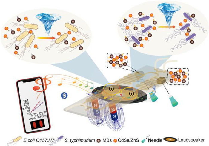 In this work, we developed a microfluidic biosensor for multiplex immunoassay of E. coli O157:H7 and Salmonella typhimurium (S. typhimurium) simultaneously with agitation driven by programmed audio signals (Fig. 1). The multiplex detection of two target bacteria depended on the design of the microfluidic chip, where rapid and sensitive detection was attributed to agitation during immune-incubation. The symmetrical design of the chip ensured that the immune sandwich reactions could be carried out simultaneously and separately to reduce non-specific adsorption and improve detection sensitivity. Magnetic beads (MBs) and CdSe/ZnS QDMs were modified with antibodies for specific recognition of the two target bacteria, which were preloaded into the separated storage chambers on the chip, and became subject to pre-vacuum treatment. MBs made the capture, washing, separation, and enrichment of target bacteria under the corresponding external magnetic fields easily. CdSe/ZnS quantum dots, as the signal reporter of the target bacteria, exhibited strong red fluorescence under UV light, which could be easily recorded by a smartphone. When the sample was injected, the pre-vacuum chamber was pierced by needles to release the reagents, which were mixed through the serpentine channels and reached the incubation chambers. Then the smartphone started playing music, which was amplified by a loudspeaker through Bluetooth to generate the mechanical vibration of the speaker cone, accelerating the formation of sandwich-structured complexes of target bacteria within 10 min on the chip pasted on the speaker cone. This vibration-assisted reaction mechanism new in this paper was used for accelerating the mass transport during the immunoreaction for the first time. After washing away the surplus reagents and enrichment, the fluorescent signals were recorded by a smartphone and analyzed by a self-designed app. The whole analysis was within 30 min (Fig. S1 in Supporting information).