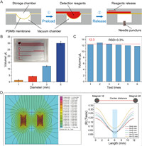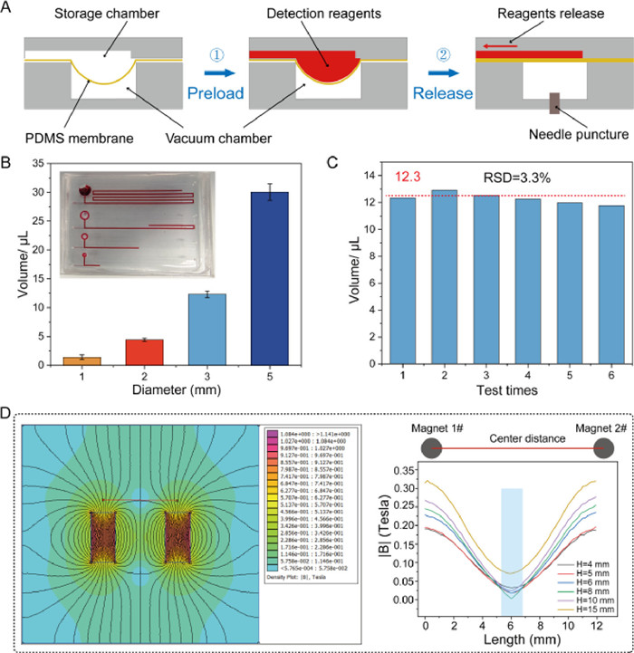 | Fig. 2. Main characterization of the microfluidic chip. (A) The principle of reagents storage and release from a vacuum chamber. (B) Effect of the different diameters of the vacuum chamber (n = 3). (C) Reproducibility of the chips. (D) Simulation of the magnetic fields. | |