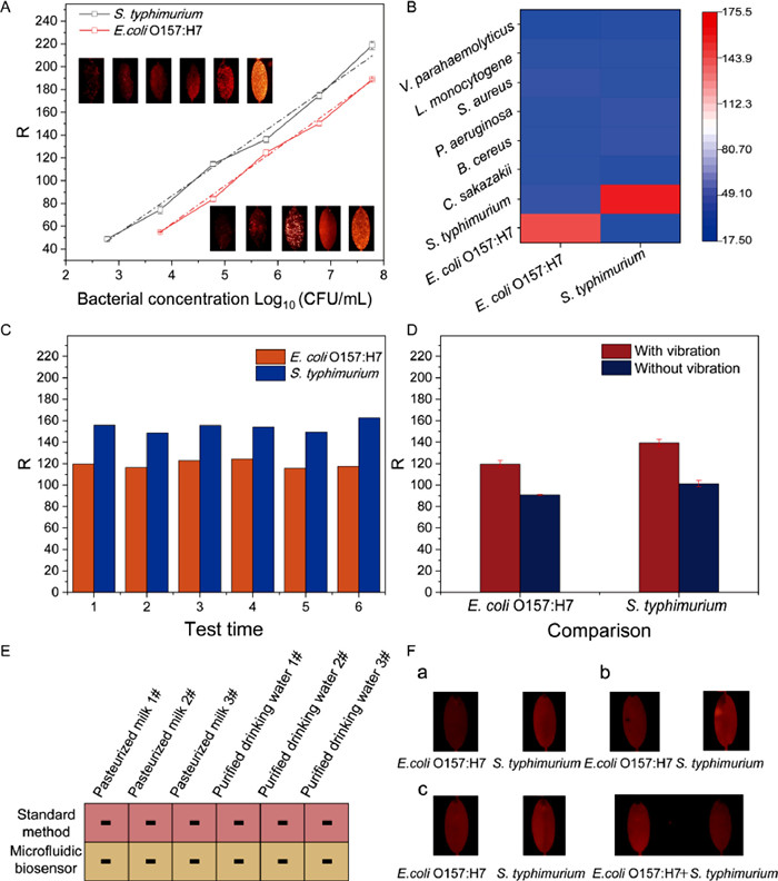 | Fig. 4. Performance evaluation of the microfluidic biosensor. (A) Linear fitting curves between fluorescence intensity and the logarithm of target bacteria. (B) Specificity evaluation of the microfluidic biosensor. (C) The reproducibility evaluation of the microfluidic biosensor. (D) Comparison of the fluorescence intensity with and without vibration. (E) Natural samples detection. (F) Real samples: (a) milk, (b) tomato, and (c) cabbage spiked tests. | |