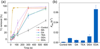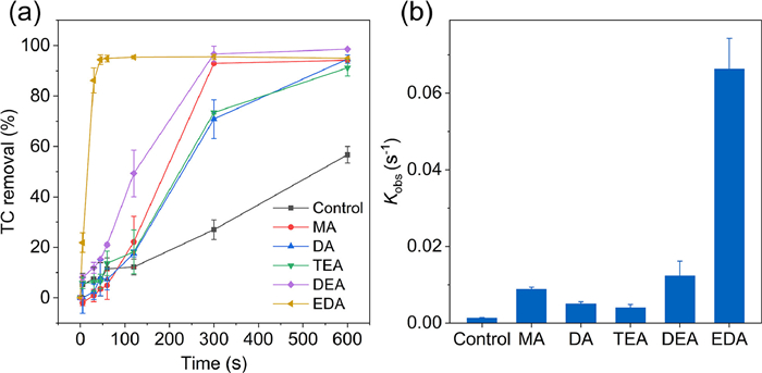 To further demonstrate the promotion of TC degradation in Fe/H2O2 system by nucleophiles, several nucleophiles, such as MA, DA, TEA, DEA and EDA, were selected as co-existing organics. The impact of various nucleophiles on the degradation of TC is illustrated in Fig. 2. As shown in Fig. 2a, the addition of nucleophiles all facilitates TC degradation. The addition of EDA, in particular, demonstrates the most significant promotion effect with a 94.39% removal efficiency of TC achieved within 45 s. Fig. 2b illustrates the Kobs values for various nucleophilic additions, with DEA, MA, DA, TEA and the control group, exhibiting Kobs of 0.01226 s−1, 0.009 s−1, 0.00405 s−1, 0.00445 s−1 and 0.00127 s−1, respectively. As complexing agents, nucleophiles can capable of forming complexes with iron ions that alter the redox potential of Fe3+/Fe2+ [26]. Meanwhile, nucleophiles exhibit a relatively weak electron-accepting ability compared to electrophiles in the complexing agent, which significantly diminishes the competitiveness for electrons [27].