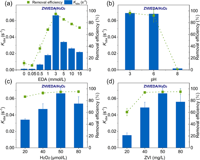 H2O2 could facilitate the release of electrons from ZVI, thus, effect of H2O2 dosage on removal rate of TC and the reaction rate Kobs was investigated [14]. Fig. 3c illustrates the removal rate of TC and the reaction rate Kobs at varying H2O2 dosage. It is evident that the removal rate of TC and the reaction rate Kobs exhibit an increase with the increasing of H2O2 dosage from 20 µmol/L to 50 µmol/L. However, with the increasing dosage of H2O2, the reaction efficiency diminishes. This is attributed to the self-quenching effect of excessive H2O2, which diminishes treatment efficiency and reactivity of ZVI/EDA/H2O2 system [29].