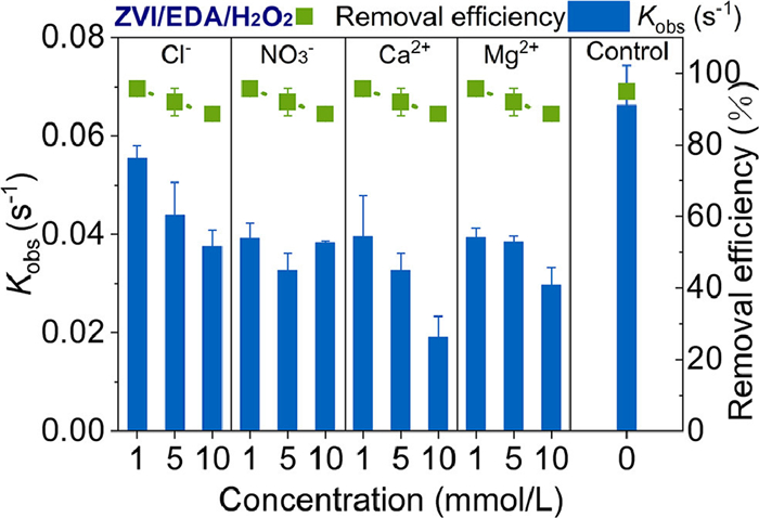 | Fig. 4. Effect of ions present in aqueous solution on the removal efficiency and pseudo-first-order rate constant of ZVI/EDA/H2O2 system to degrade TC. Reaction conditions: T = 30 ℃, pH 6, ZVI = 50 mg/L, [H2O2] = 50 µmol/L, EDA = 3 mmol/L. | |